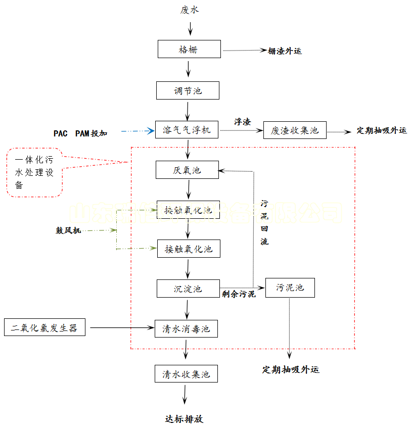 廢水首先經(jīng)過機(jī)械格柵進(jìn)入處置系統(tǒng),格柵可以去除廢水中較大粒徑的懸浮物、漂浮物、皮毛、肉屑、骨屑、血污等雜質(zhì),出水進(jìn)入隔油調(diào)理池,此池前部為隔油池,去除廢水中部分油脂,后部為調(diào)理池,對水量及水質(zhì)中止調(diào)理。調(diào)理池出水由提升泵提升至氣浮池,氣浮采用一元化氣浮裝置,它由池體,溶氣罐、空壓機(jī)及回流水泵組成,由一個電控箱中止控制操作。廢水中有大批的粗大懸浮物及油脂,經(jīng)過氣浮裝置的處置可大大降低上述污染物濃度,在氣浮設(shè)備義務(wù)時參與高分子絮凝劑,廢水經(jīng)加藥反響后進(jìn)入氣浮池內(nèi),與經(jīng)過TJ型釋放器釋放的氣泡充分混合接觸,使水中的絮凝體粘附在宏大氣泡上,釋放的氣泡平均直徑Φ30um左右,絮體浮向水面構(gòu)成浮渣,浮渣聚集到一定厚度后,由刮渣機(jī)刮入氣浮泥槽道送到污泥濃縮池,氣浮池下層的清水一部分經(jīng)溶氣泵抽送供溶氣水運用,剩余的清水經(jīng)過溢流管進(jìn)入后續(xù)處置單元。氣浮可以去除80—90%的懸浮物和40—50%的CODcr。同時,由于在氣浮池內(nèi)參與了混凝劑,與廢水中的磷酸鹽反響,生成更難溶于水的鹽類,從而將廢水中的磷較好的去除,添加了后續(xù)除磷處置單元的負(fù)荷。